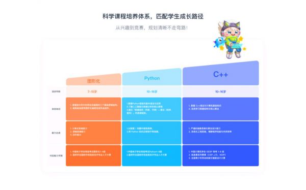 覆盖了Scratch、Python、C++等主流编程语言,课程从图形化编程的启蒙课程到Python代码课,再到C++信奥课程,难度由浅入深,逐步提升。